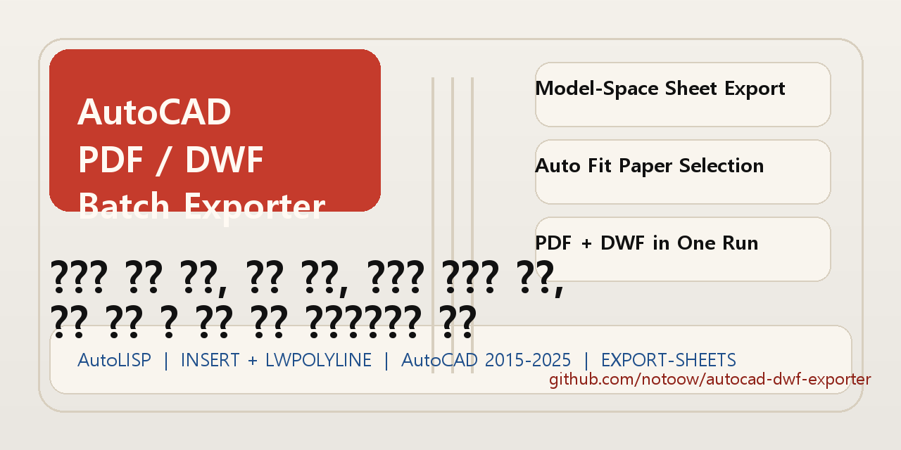 AutoCAD에서 DXF 일괄 추출, PDF 일괄 출력, DWF 내보내기, sheet export가 필요할 때 쓰는 AutoLISP 도구입니다. 기본 출력은 DXF이고, 자동 용지 맞춤, 내용 크롭, 샘플 선택 후 감지 개수 미리보기, 그리고 DXF + PDF + DWF 다중 출력까지 지원합니다.